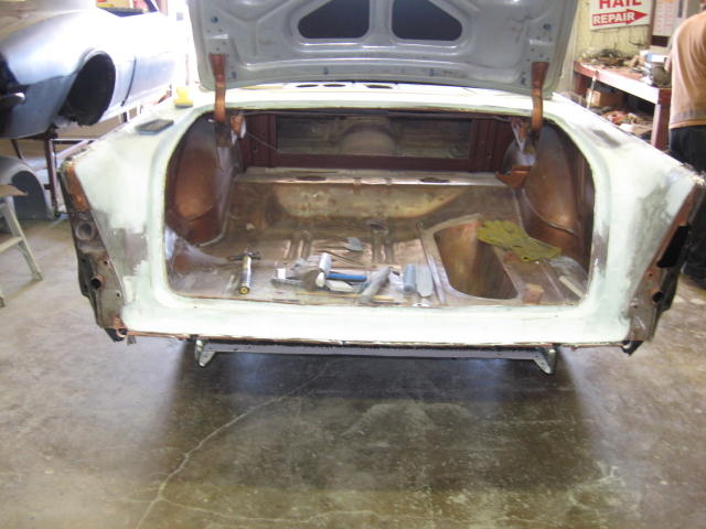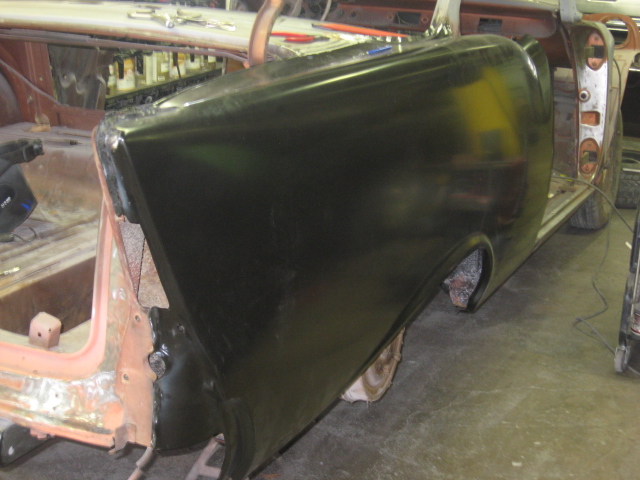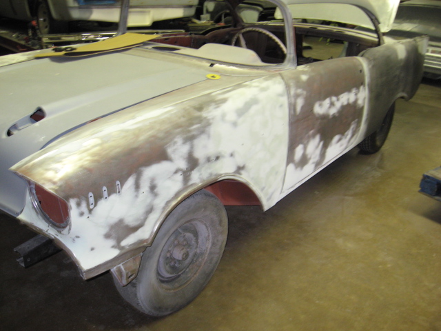 1957 CHEVROLET BELAIR HARDTOP THIS 57 CHEVY WAS BROUGHT IN FOR PAINT AND BODY!!! WE STRIPPED THE CAR DOWN AND REPLACED BOTH QUARTER PANELS AND TRUNK LID!!! ALL THE BODYWORK IS NOW DOWN, THE CHASSIS IS POWDERCOATED AND THE PAINTWORK BEGINS!!! THE ENGINE IS A REBUILT 327 BACKED BY A 3 SPEED WITH AN ELECTRIC OVERDRIVE!!! |