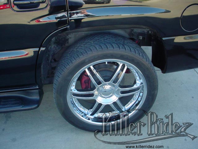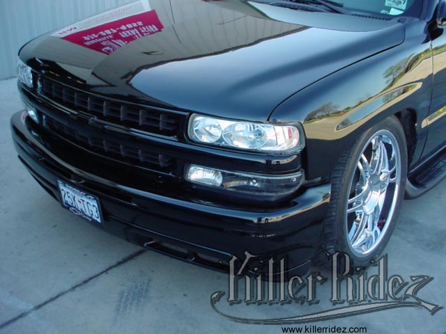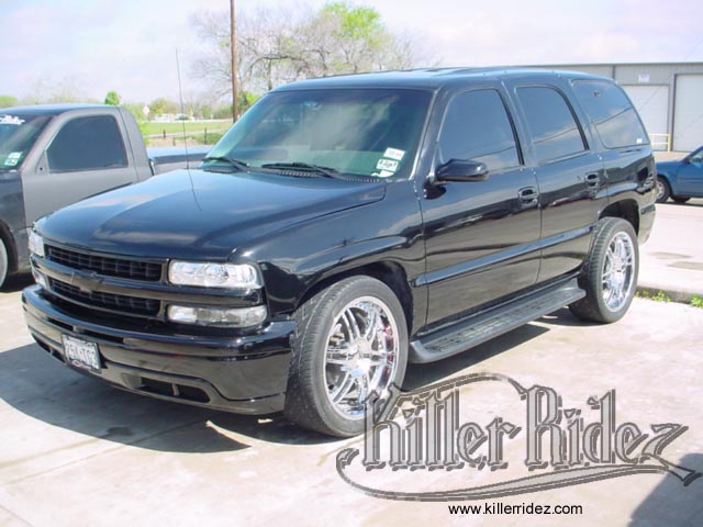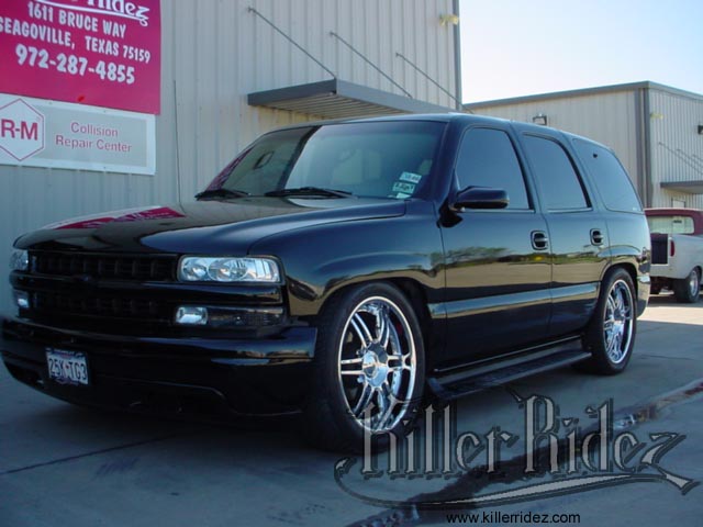 2001 CHEVY TAHOE WE BAGGED THIS 2001 TAHOE USING AN AIR RIDE TECHNOLOGIES KIT!!! IT ALSO SPORTS A CHROME SET OF 22'S, ROLLPAN, AND BLACKED OUT EVERYTHING!!! |