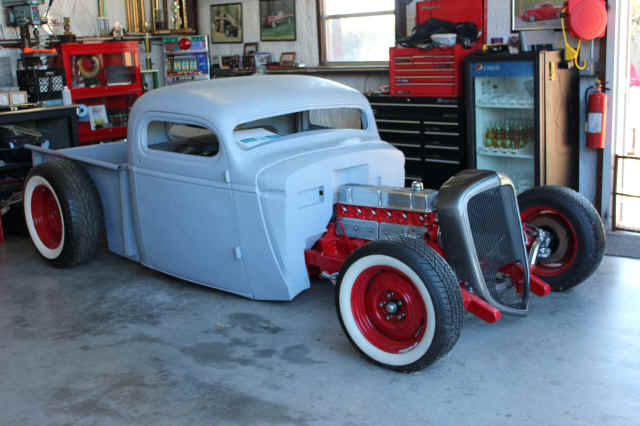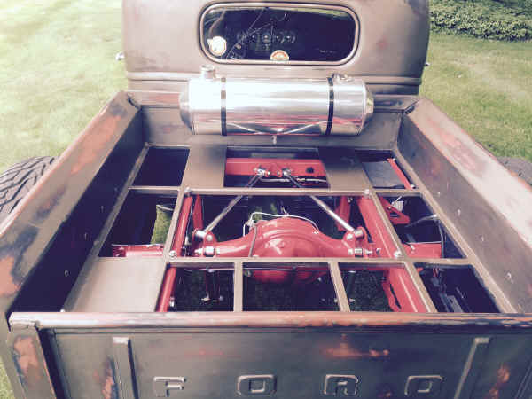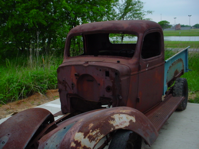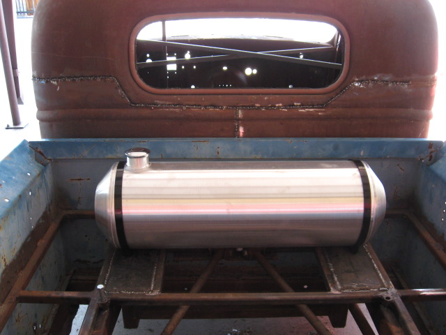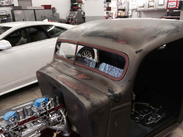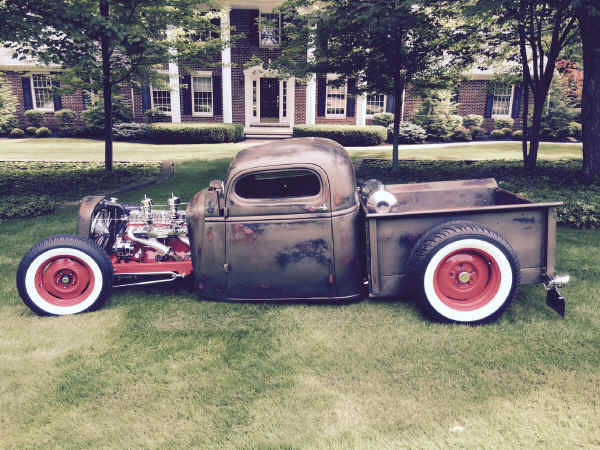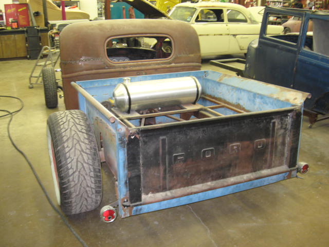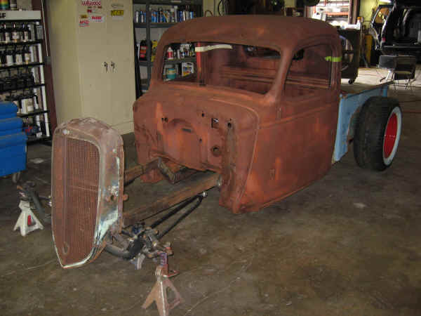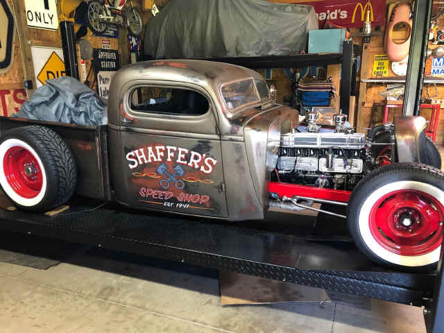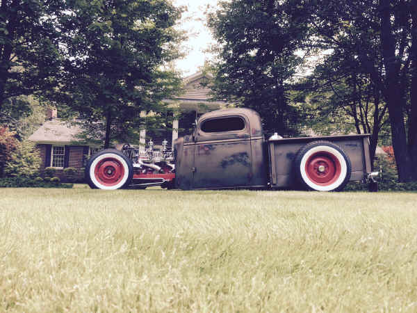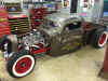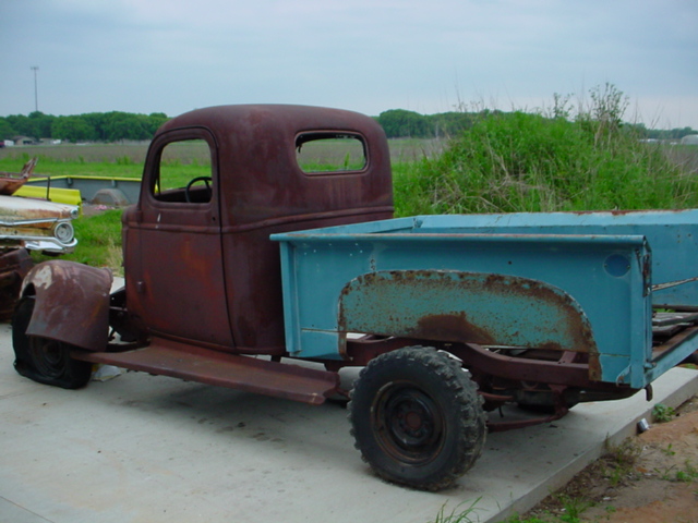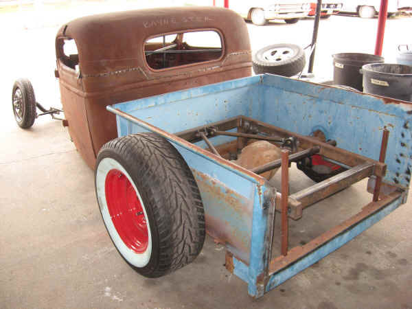 1941 CHEVY P/U THIS 1941 CHEVY P/U CAB AND FRAME WERE PICKED UP BEHIND AN OLD BARN!!! THE BODY CONSIST OF A '41 CHEVY CAB, '36 CHEVY 1 TON (BEER TRUCK) GRILL AND DASH AND A '53 FORD BED!!! THE RUNNING GEAR IS A 1969 250 CHEVY STRAIGHT 6, TURBO 350 TRANNY AND 9" REAREND FROM A 1959 FORD GALAXY!!! THE FRONT SUSPENSION IS A CLASSIC 6" DROP TUBE AND THE REAR IS A COMBINATION OF A SUICIDE DOORS & PETE & JAKE'S 4 LINK WITH FIRESTONE AIRBAGS!!! WE CHOPPED THE TOP 8 1/2", ALONG WITH CHANNELING IT DOWN OVER THE CUSTOM BUILT FRAME!!! IT ROLLS ON 15" & 17" WHITEWALLS!!! |