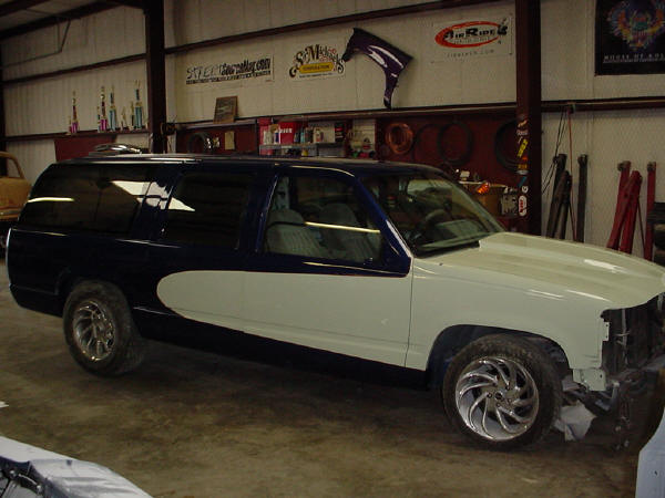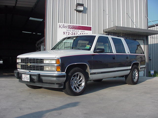 1992 CHEVY SUBURBAN "SSCALADE" WE THEN UPGRADED THE REAR BRAKES TO A SSBC REAR DISC SETUP!!! THIS DAILY DRIVEN 1992 CHEVY SUBURBAN BEEN BROUGHT BACK TO THE SHOP FOR FULL PAINT/BODY, INCLUDING AN ESCALADE FRONT CLIP, SHAVED DOOR HANDLES, CADDY TAILLIGHTS, ROLLPAN AND CUSTOMER DESIGNED 2-TONE PAINT!!! THE 'BURB WAS ORIGINALLY BROUGHT IN FOR A BELLTECH 3-4 DROP, WITH HELLWIG SWAYBARS AND COMPLETE SUSPENSION REBUILD!!! |