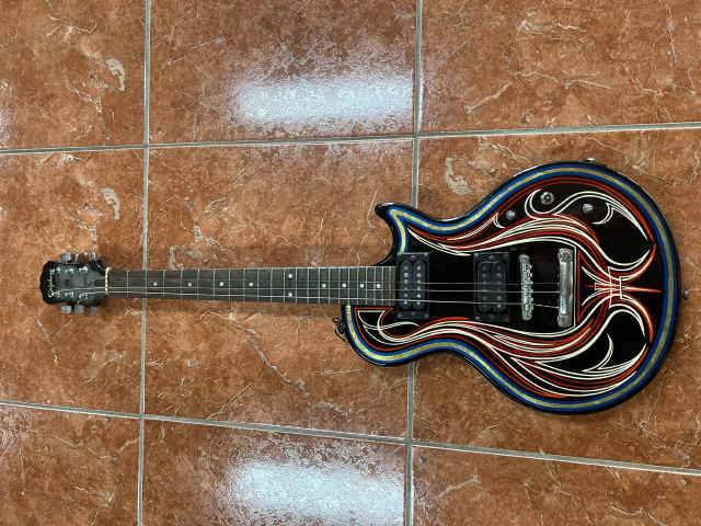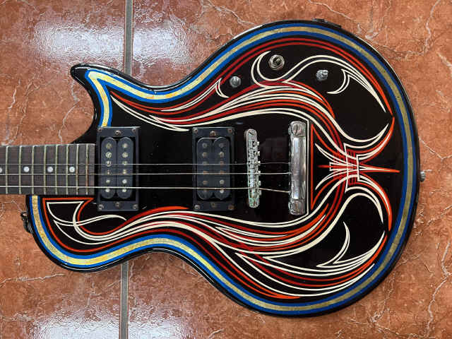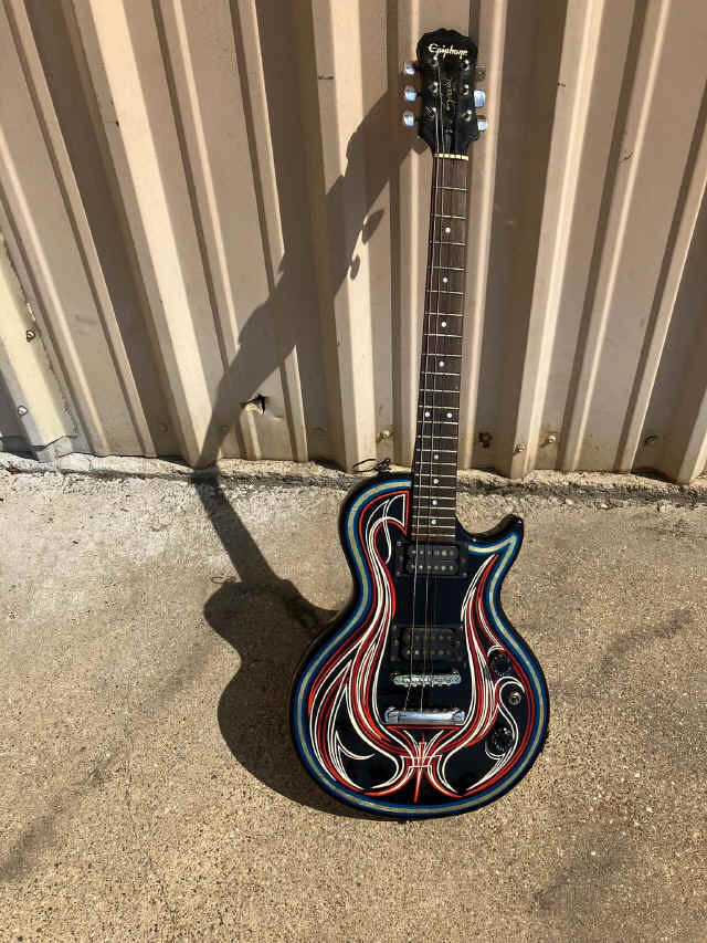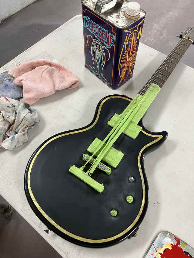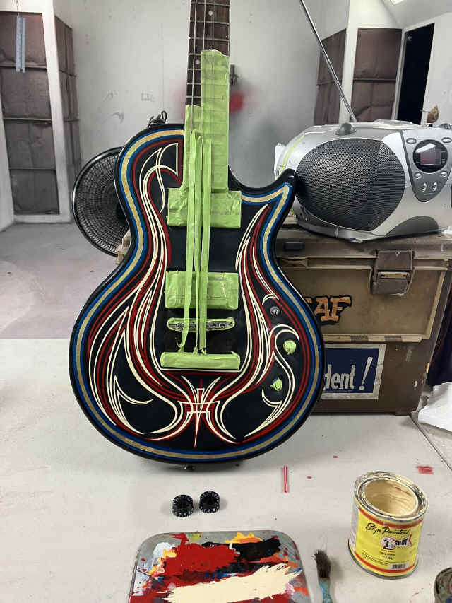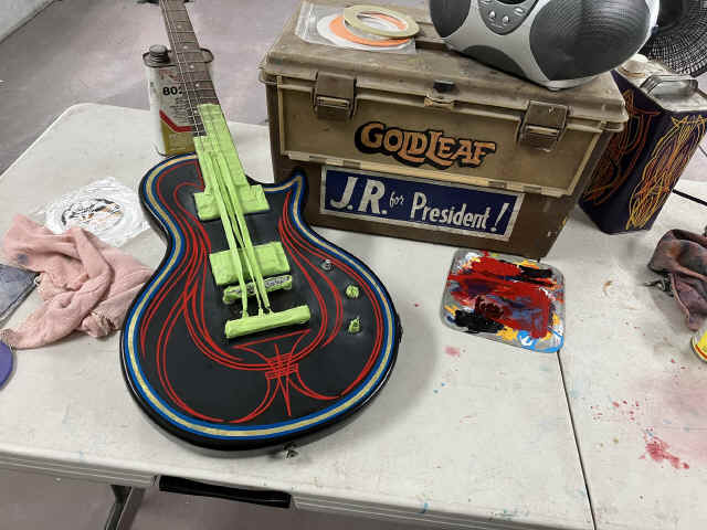 THIS OLD ELECTRIC GUITAR WAS BROUGHT TO US TO MAKE A COOL WALL HANGER SINCE IT WAS NO LONGER FUNCTIONAL!!! DIRTY OF DALLAS HIT THIS ONE OUT OF THE PARK ON THE STRIPING AND GOLD LEAF!!!