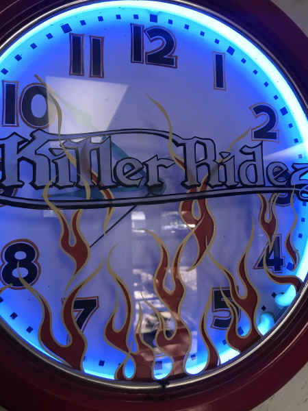 KILLER KLOCK WE JUST CAN'T LEAVE ANYTHING STOCK!!! THIS NEON CLOCK WAS PAINTED VIPER RED!!! THEN OUR LOGO WAS ETCHED ON THE GLASS AND FLAMES WERE ADDED!!! LASTLY, SOME PINSTRIPING BY DIRTY OF DALLAS!!!
